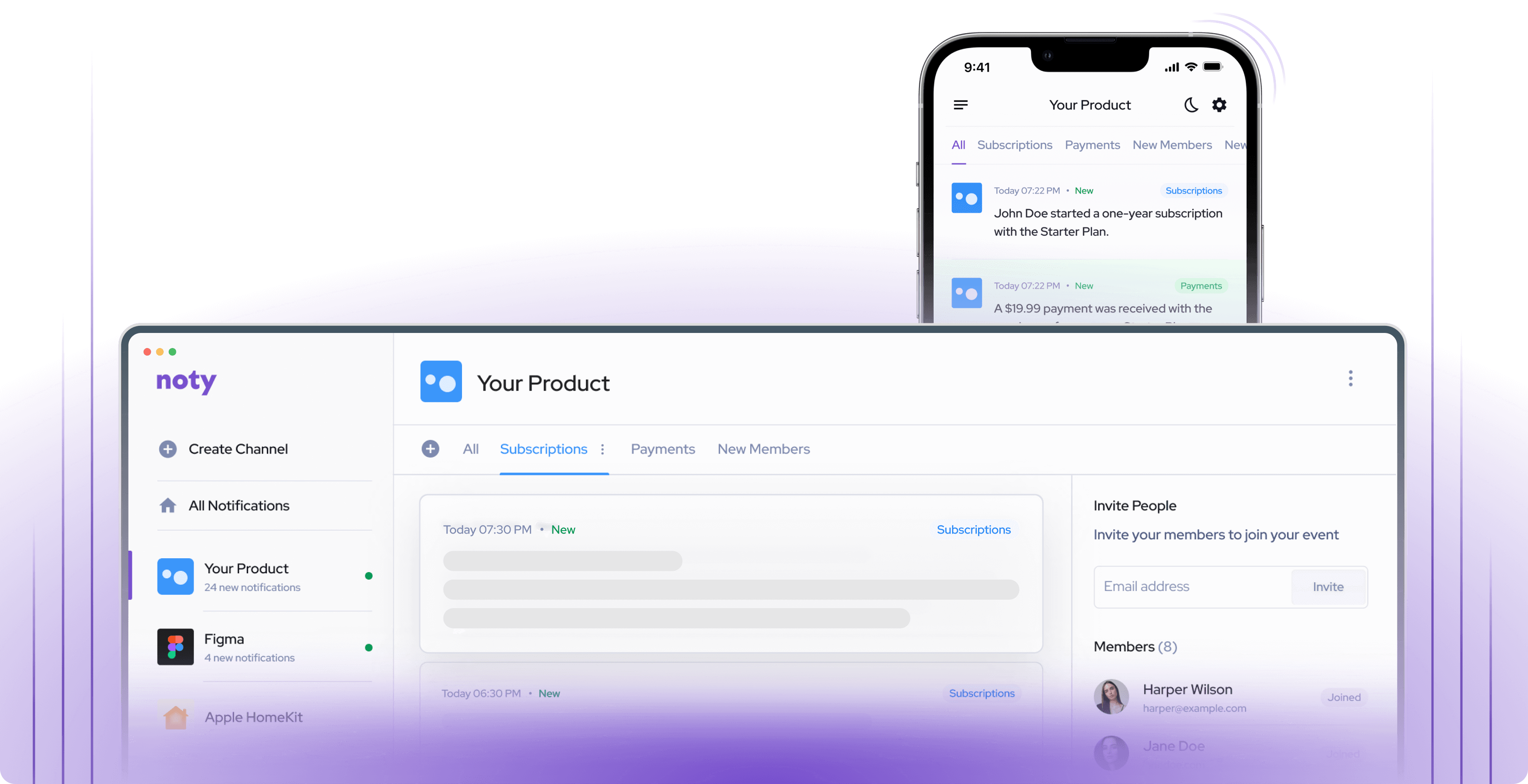 Noty allows users to create and manage multiple channels for organizing their notifications. Channels enables users to easily access the information they need and stay on top of their workflows and important matters.